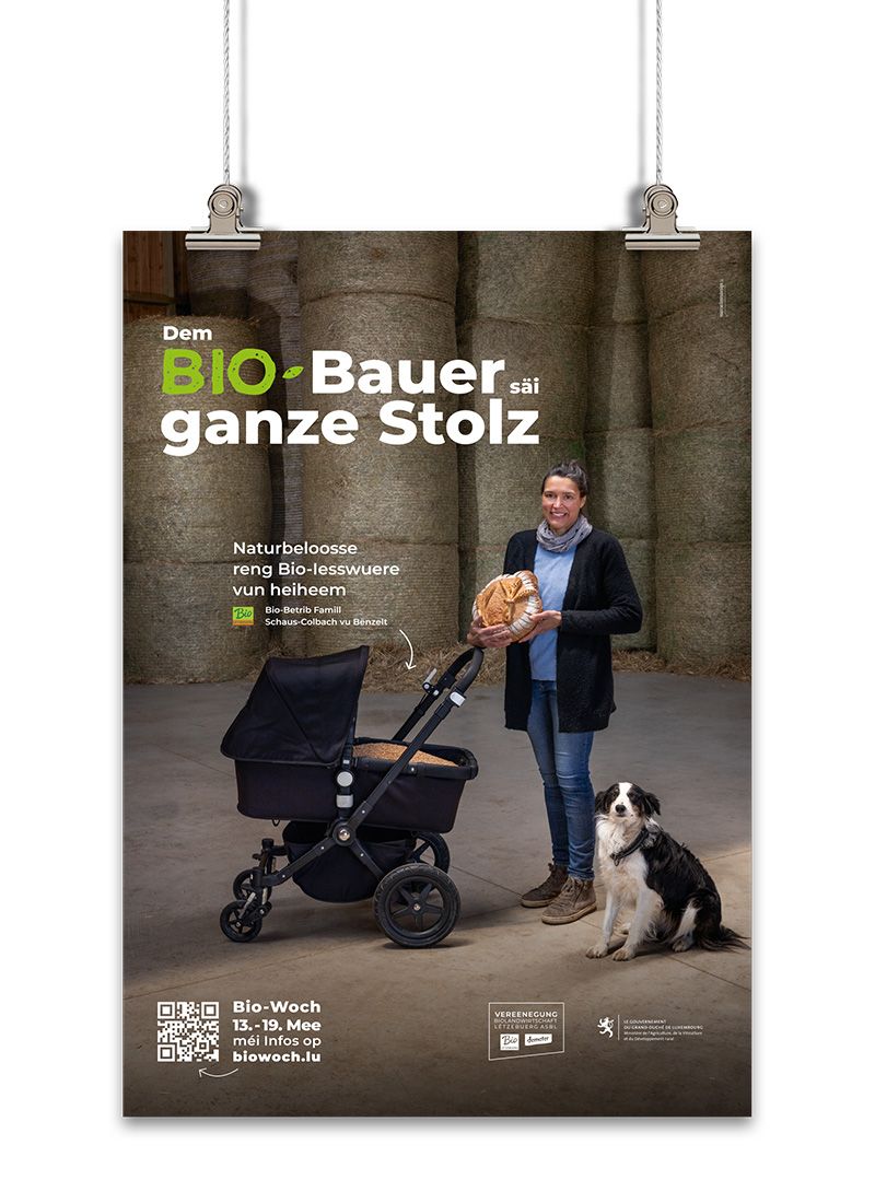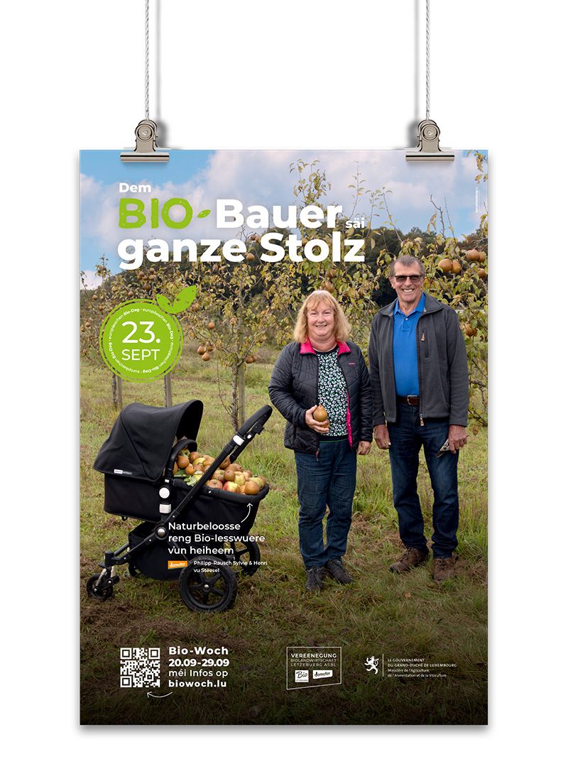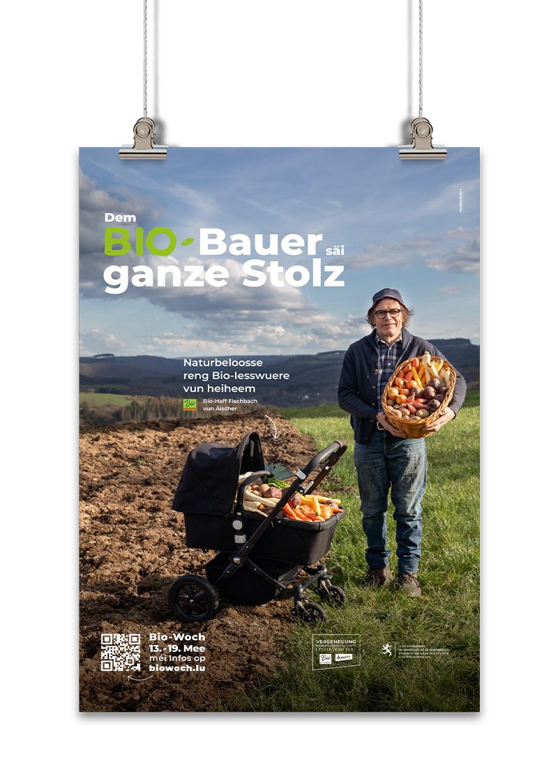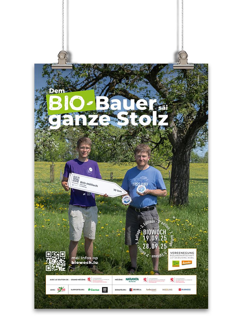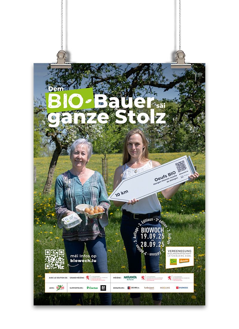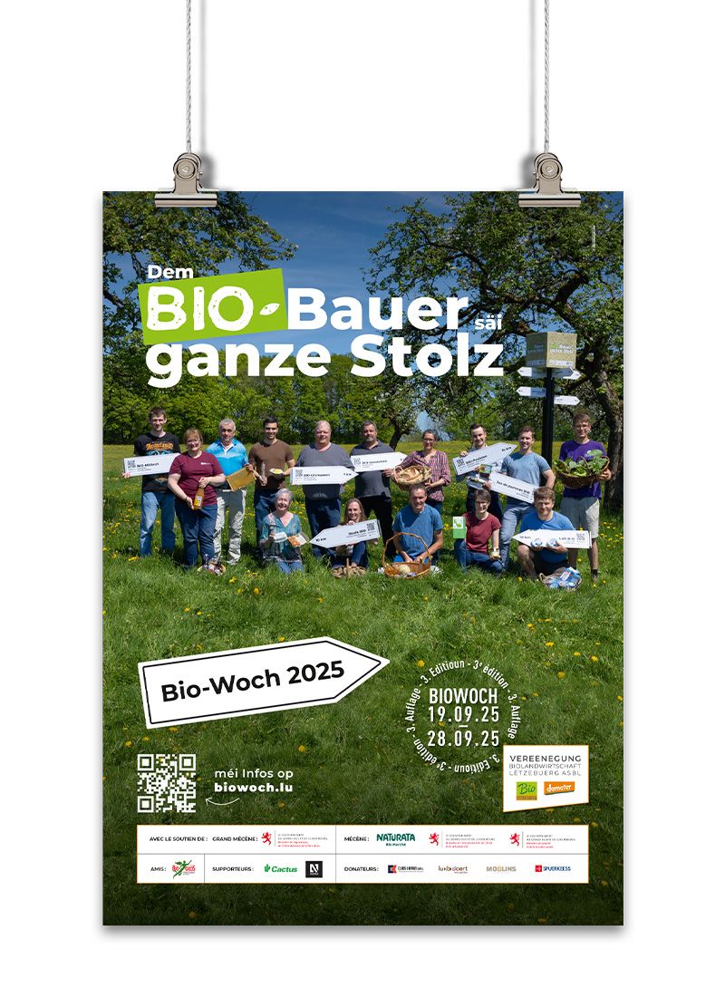 The Vereenegung fir Biolandwirtschaft Lëtzebuerg organises, with the support of the Ministère de l’Agriculture, de l‘Alimentation et de la Viticulture, a large-scale awareness campaign in the form of an organic week entitled ‘Dem Bio-Bauer säi ganze Stolz’ to promote organic farming and its products.