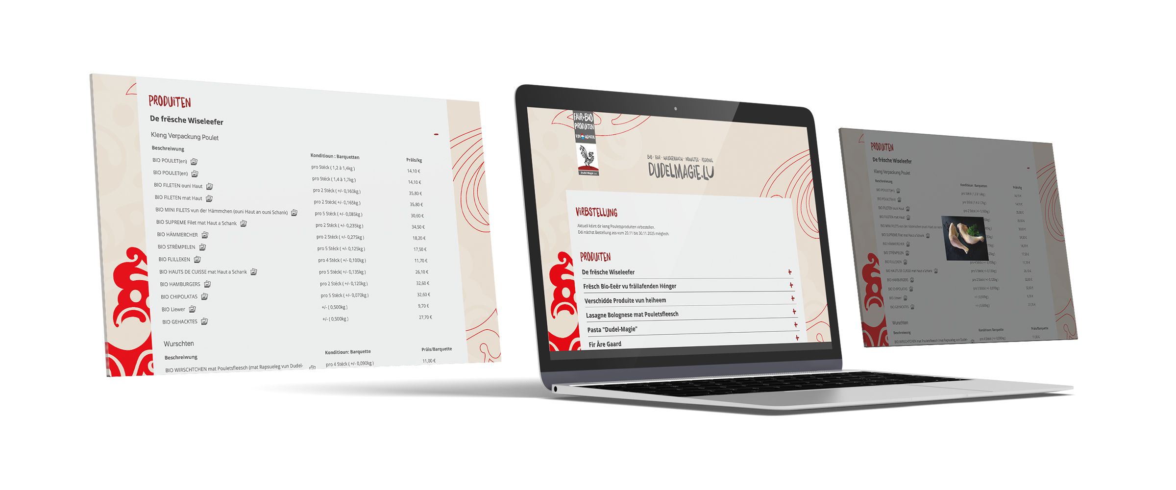 Using the existing logo as a starting point, a visual identity is created that picks up on the main colours and gives the products and media an individual, consistent style based on strong graphic elements. The programmed ordering system for all of the farm's organic products simplifies product management and is used intensively by customers, especially before slaughter dates.