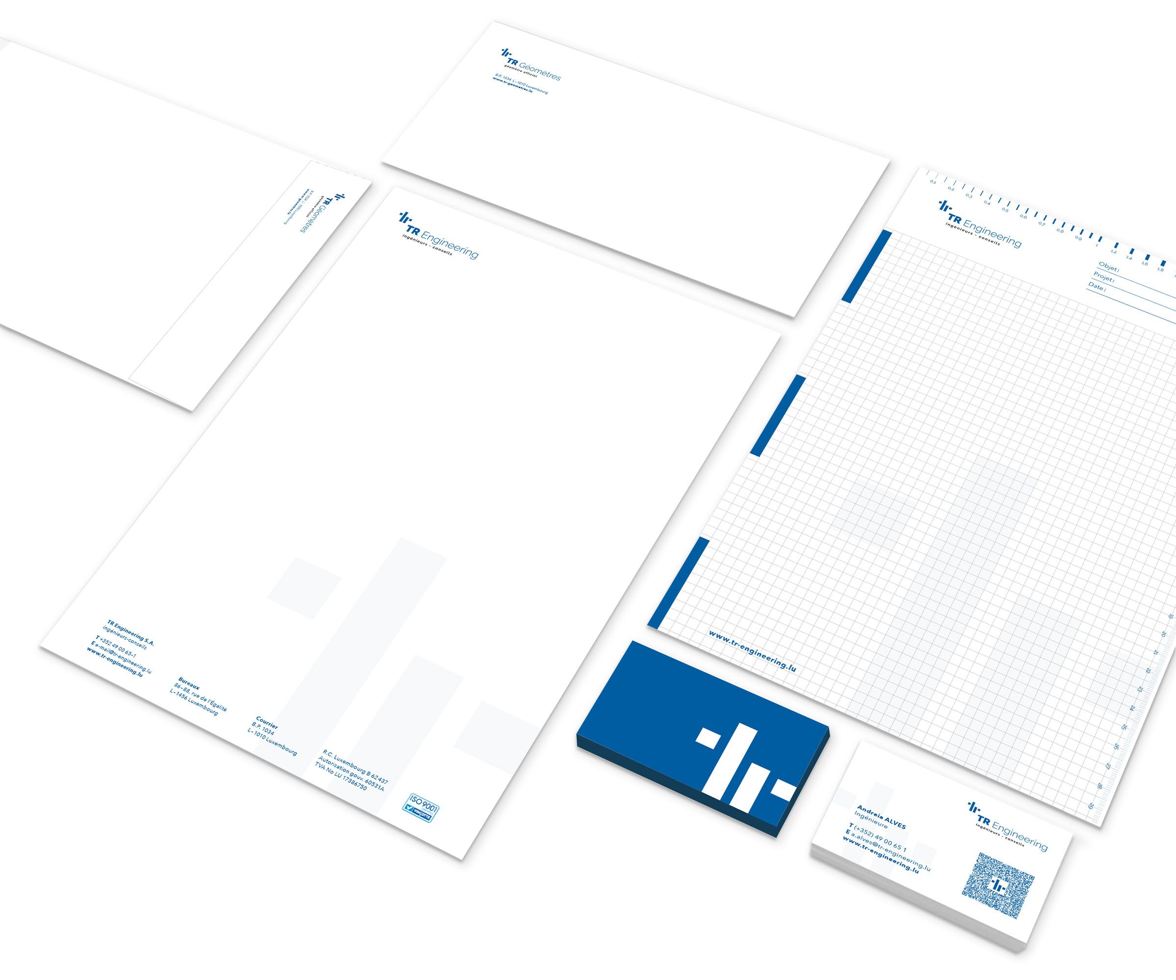 The engineering firm TR Engineering, together with its subsidiaries TR Géomètres and LuxAuTec, bases its internal and external communication on a clear, minimalist graphic language. The three logos bear the same signature and demonstrate the unity of the group of companies. The entire appearance is based on the two-tone colour scheme of black and dark blue. This colour scheme, in combination with large white areas, creates a distinctive, clean look that reflects the structured nature of engineering.